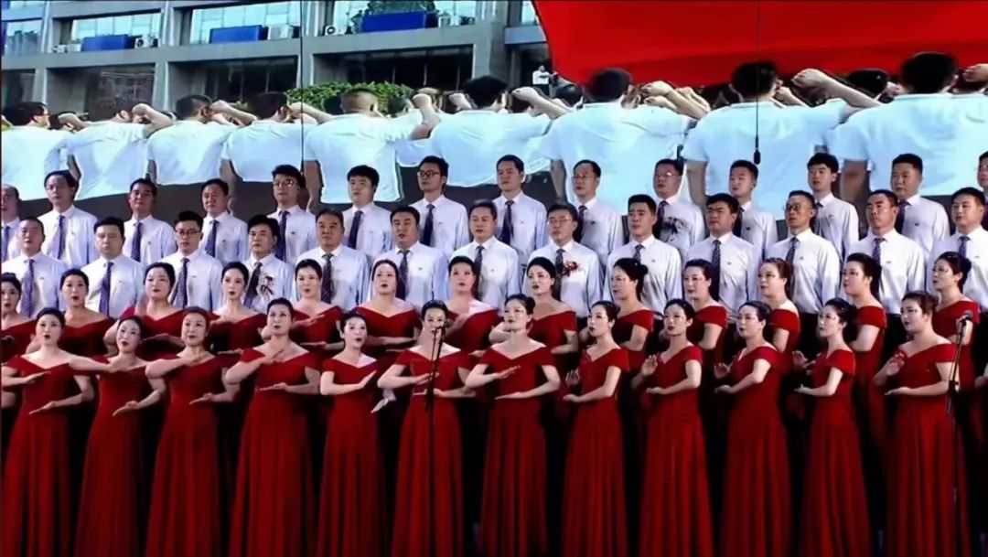 人社合唱隊員們個個精神飽滿、姿態昂揚,身后大屏輔以人社近來優秀工作成果展示,臺前更有現場樂隊精心組織,紅歌嘹亮,黨旗飄揚,相得益彰,展現出人社局黨員干部“爭一流、爭第一、爭唯一”投身建設創新型高品質現代化示范區的奮發向上的精神風貌。