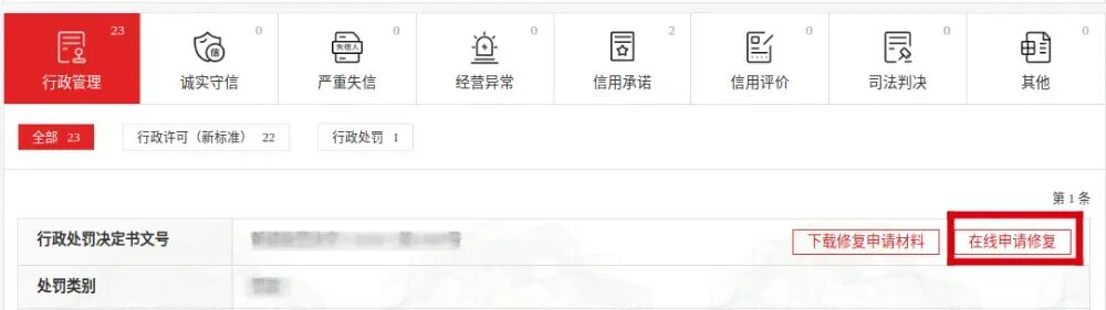 4. 看處罰信息右上角的“在線申請修復”按鈕:紅色就能申請,灰色就是還沒到能申請的最短公示期,得再等等。