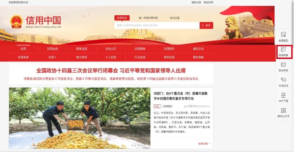 1. 打開“信用中國”網站,點右上角的“信用修復”;
