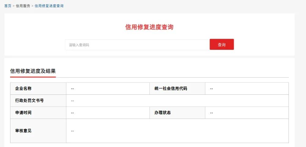 3. 輸入查詢碼,就能看到申請進度:比如企業名稱、處罰文書號、申請時間、審核狀態和意見。
